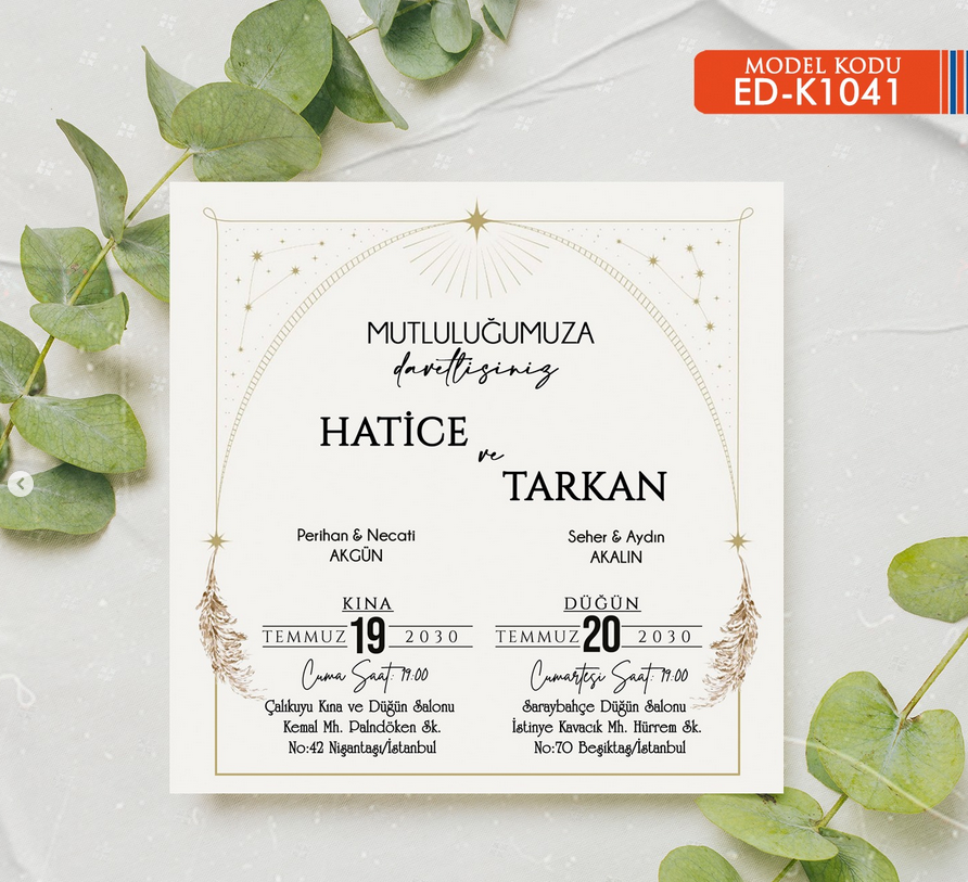Beğendiğiniz davetiyeyi web sitemiz üzerinden seçerek siparişinizi oluşturun ve ödeme işlemini tamamlayın.